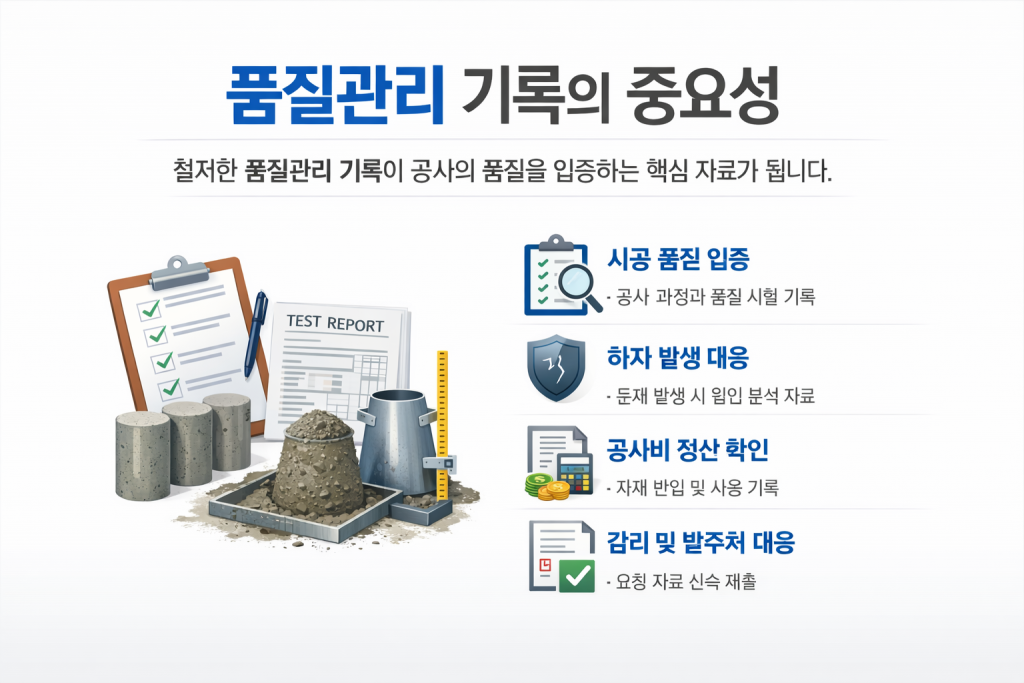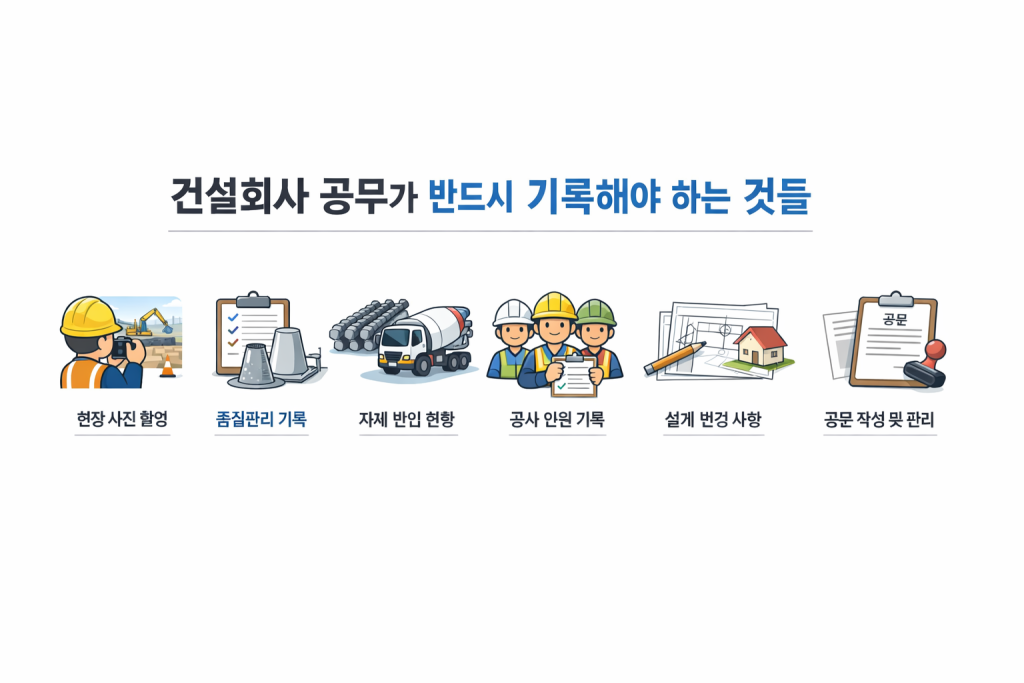 예를 들어 콘크리트 공사의 경우 레미콘 강도, 슬럼프 시험, 공시체 제작 여부, 타설 시간, 타설 위치 등이 기록으로 남아 있어야 품질관리가 제대로 이루어졌다고 말할 수 있습니다. 철근공사의 경우에도 철근 규격, 반입 수량, 배근 상태, 이음 및 정착 상태 등을 사진과 문서로 남겨야 나중에 시공 품질을 확인할 수 있습니다.