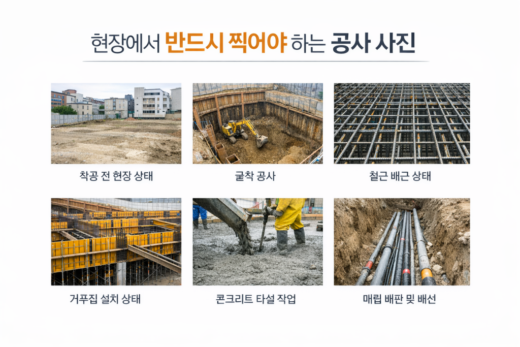 공정별로 시공 전, 시공 중, 시공 완료 사진을 남겨 두는 것이 중요합니다. 특히 철근 배근, 배관 매설, 방수 작업 등 마감 이후 확인이 어려운 공종은 반드시 사진을 남겨 두어야 합니다.
