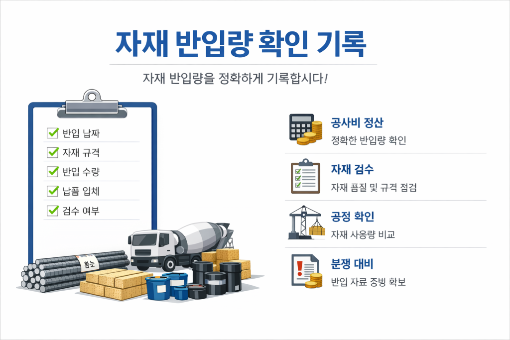 철근, 레미콘, 방수 자재, 단열재 등 주요 자재는 반입 날짜, 규격, 수량, 납품 업체 등을 기록하여 자재 관리와 공사비 정산에 활용할 수 있도록 해야 합니다.